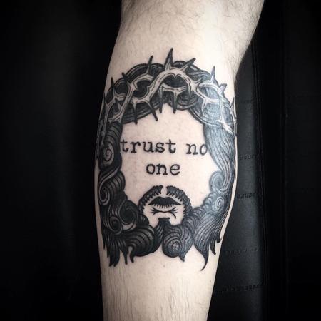 Trust No One Tattoo. The Trust No One tattoo is a very interesting text tattoo because you can never really be sure why a person chooses to get that particular text on their skin. Simple text Trust no one tattoo: The trust no one tattoo does not symbolize any image or picture but a feeling which when written in simple text can Fingers crossed Trust no one tattoo: Fingers when crossed by someone means that the person is trying to avoid some situation or praying for something.